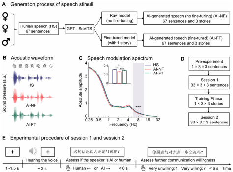 基于知觉学习的理论,研究团队提出核心假设:虽然人们的听觉系统初始是为处理人声而“调谐”的,但通过短期的知觉训练,可能能够重新“调谐”,使其对AI与人声之间的细微声学差异变得敏感。本研究旨在探究一个简短、生态效度高且易于实施的训练,是否能增强听者对AI生成语音的辨别能力,并结合脑电图(EEG)技术,揭示其背后的神经机制。
