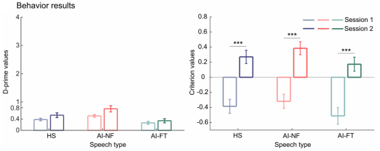 均处于极低水平(接近0),表明其几乎无法准确辨别两类语音。重复测量方差分析发现,训练轮次(前测vs.后测)的主效应不显著,说明简短训练未带来行为辨别能力的显著提升。然而,训练显著改变了被试的反应偏向:训练后,所有语音类型下的c值均显著增大,表明被试从训练前倾向于将语音判断为“信号”(真人)的策略,转变为训练后更保守的策略,即更倾向于将语音判断为“非信号”(AI)。这一结果提示,虽然训练未提升辨别敏感性,但参与者学会了调整判断阈值。