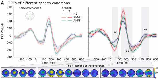 时间响应函数分析揭示了训练前后的关键神经变化。在训练前,三种语音类型(HS, AI-NF, AI-FT)诱发的时间响应函数波形在统计上无显著差异。但在训练后,基于聚类的置换检验识别出三个显著的时间-空间聚类,分别位于刺激开始后约55毫秒、210毫秒和455毫秒。这表明,短时训练使大脑听觉系统在早期和晚期加工阶段,对真人语音与AI语音产生了显著的神经反应差异。空间分布上,早期成分在左侧前部电极(如F3)差异更明显,而晚期成分则表现为更广泛的额-中央-顶叶分布。