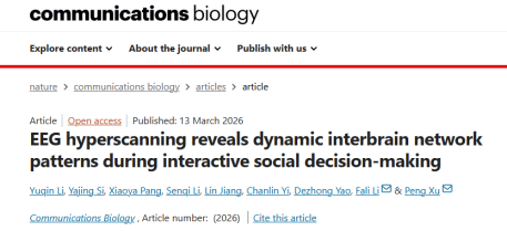 Li, Y., Si, Y., Pang, X., Li, S., Jiang, L., Yi, C., ... & Xu, P. (2026). EEG hyperscanning reveals dynamic interbrain network patterns during interactive social decision-making. Communications Biology.
