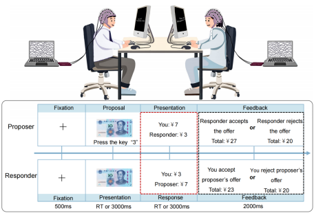 本研究共纳入72对陌生被试,共计144名健康右利手大学生,采用迭代式最后通牒博弈任务考察社会互动决策中的脑间同步特征。实验中,一名参与者担任提议者,另一名参与者担任回应者;提议者需要在公平分配(5:5)和两种不公平分配(7:3、9:1)之间作出选择,随后由回应者决定接受或拒绝该提议,之后双方共同接收反馈信息并查看累计收益。