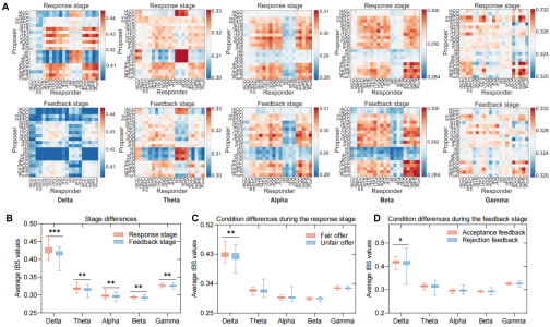 图3 群体平均静态脑间同步(IBS)网络。(A) 在反应阶段与反馈阶段中,五个频段(delta、theta、alpha、beta、gamma)的群体平均IBS矩阵;(B) 各频段中反应阶段与反馈阶段所有ROI-ROI连接的平均IBS;(C) 反应阶段不同条件(公平vs.不公平提议)下五个频段的IBS差异;(D) 反馈阶段不同条件(接受vs.拒绝)下五个频段的IBS差异