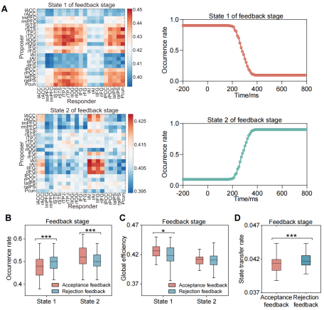 图4 反馈阶段delta频段的动态脑间同步(dIBS)。(A) 反馈阶段识别出的两种dIBS状态(左)及其时间出现率(右),出现率定义为各状态占总时间的比例;(B) 接受与拒绝条件下两种dIBS状态出现率的比较;(C) 接受与拒绝条件下两种dIBS状态脑间全局效率的比较;(D) 接受与拒绝条件下的状态转移率(dIBS状态之间的转换频率)
