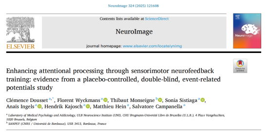 引用:Dousset, C., Wyckmans, F., Monseigne, T., Sistiaga, S., Ingels, A., Kajosch, H., Hein, M., & Campanella, S. (2025). Enhancing attentional processing through sensorimotor neurofeedback training: Evidence from a placebo-controlled, double-blind, event-related potentials study. NeuroImage, 324, 121608.