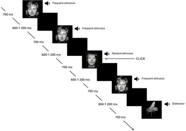 在该Oddball任务中,被试需对罕见的目标刺激(男性面孔+声音,占15%)尽快按键反应,同时忽略大量的频繁刺激(女性面孔+声音,占70%)和罕见的分心刺激(动物图像,占15%)。
