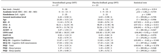 统计分析显示,NFT组与PFT组在性别、教育水平、年龄以及多项心理量表(抑郁、焦虑、冲动性等)上均无显著差异,基线匹配良好。