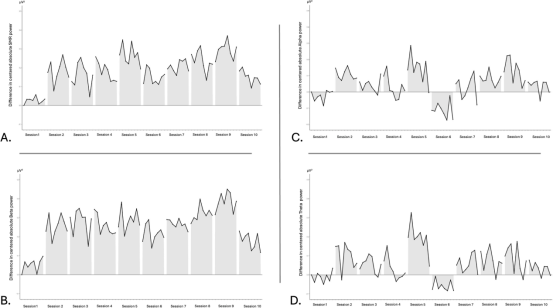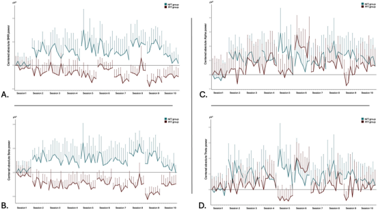 对10次训练过程的累积效应(曲线下面积,AUC)分析显示,NFT组的SMR中心化绝对功率显著高于安慰剂PFT组。同时,NFT组在紧邻的β频段(15–20 Hz)功率也实现了同步增强。而在θ和α频段上,两组无显著差异。