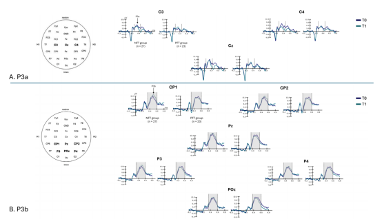目标刺激加工(P3b):出现了显著的“组别×测量时间”交互作用。事后分析表明,真实训练(NFT)组在训练后(T1)诱发的P3b振幅显著大于训练前(T0);而安慰剂(PFT)组的P3b振幅前后无显著变化。