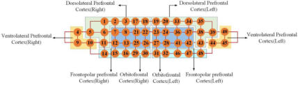 实验采用便携式功能性近红外光谱设备(NIRSIT, OBELAB)实时监测前额叶皮层的血氧浓度变化。该设备配备24个光源与32个探测器,共形成48个测量通道,采样频率为8.138 Hz,能够无创、稳定地记录大脑皮层在认知任务中的动态激活状态。