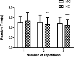 重复测量方差分析显示,反应时的时间主效应显著(F=7.095, p=0.002),组别与时间的交互作用亦显著(F=3.864, p=0.026)。事后检验表明,健康对照组在第二会话(p<0.01)和第三会话(p<0.001)的反应时均显著快于第一会话,表现出明显的练习效应。而MCI组在三次会话间均未出现显著变化,提示练习效应中断。