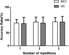 在正确率方面,Friedman检验结果显示,MCI组在三次会话间无显著差异(χ2(2)=4.84, p=0.089)。健康对照组正确率在会话间存在显著差异(χ2(2)=7.75, p=0.021),但经Bonferroni校正后未达到显著性阈值,仅表现为第三会话正确率呈改善趋势。