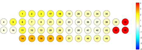 图7 重复stroop任务中前额叶皮层各通道氧合血红蛋白浓度的组别×时间交互作用热图